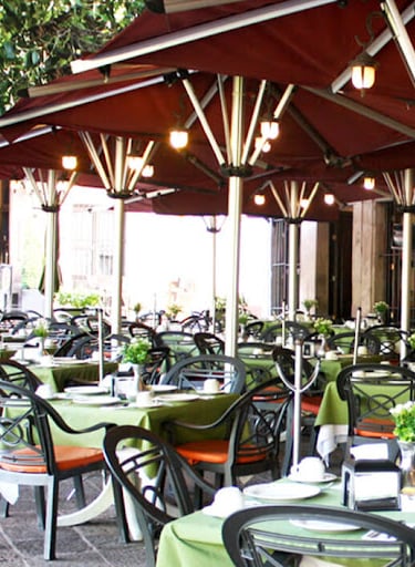 An elegant restaurant located in a restored 18th century estate, with leafy outdoor seating and a fountain.